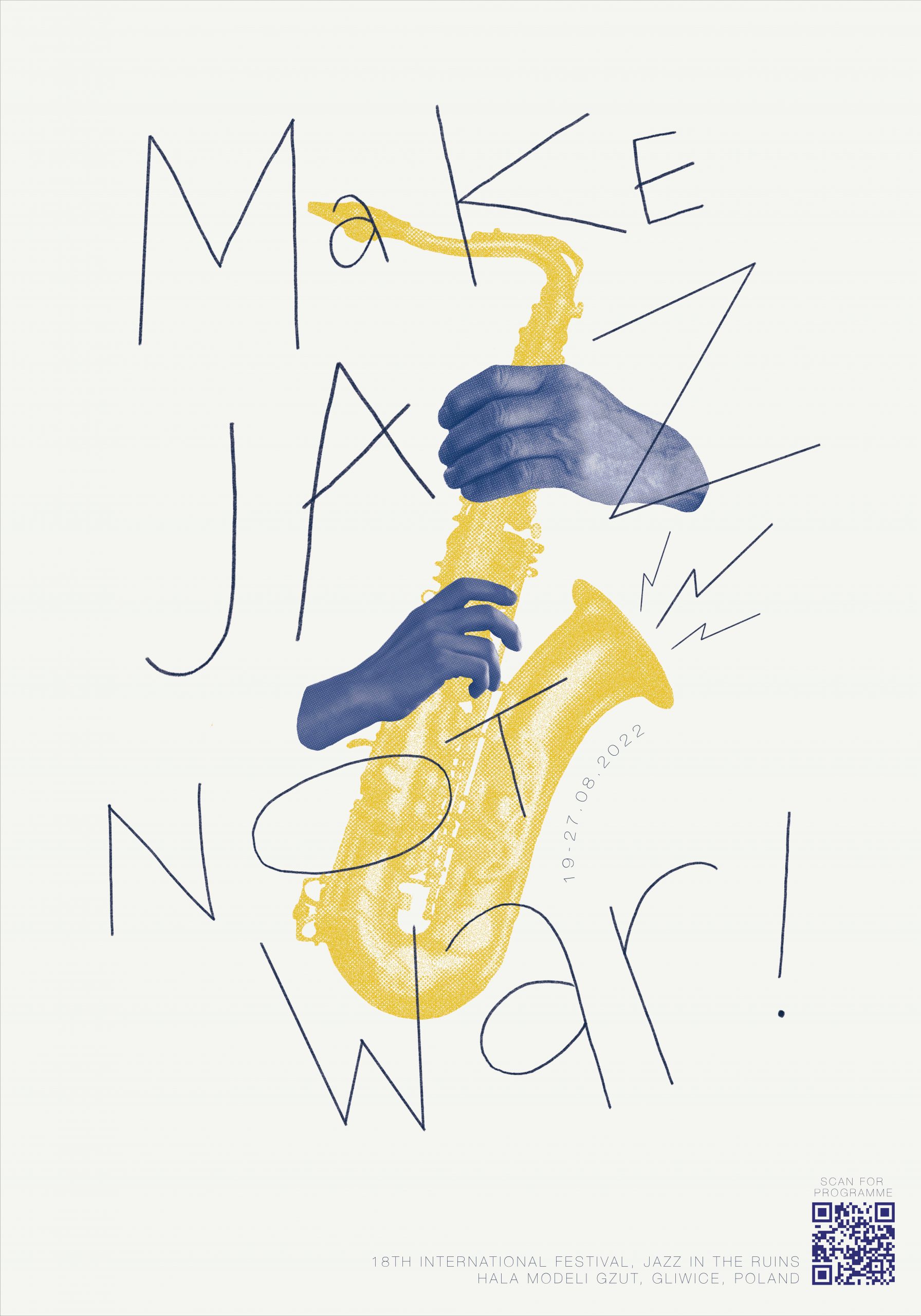 Make Jazz, Not War! Poster created for the 18th International Jazz in the Ruins Festival, located in Hala Modeli Gzut, Gliwice, Poland.